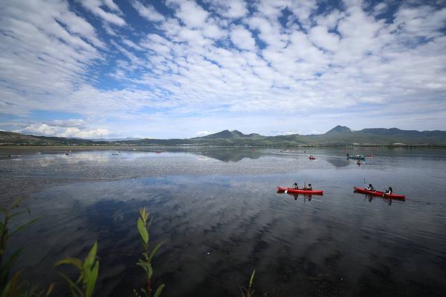 普者黑的寓意为彝语的“鱼虾很多的池塘”,在这片水域上生长的万亩野生的荷花。6月底,粉嫩色的荷花星星点点开始出现在普者黑湖上。等到7月,成片的荷花开满湖面,美不胜收。除了赏荷能让自己心沉静下来和炎热的天气对抗,还有最激情的打水仗分分钟帮你消暑。到了8月,云南的雨季基本结束,蓝天白云,映着荷花,在绿油油的水稻中散步也是一种享受。
