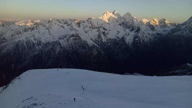 登山小队的队员们脚踏吱吱作响的雪地,身披背后的晨光!