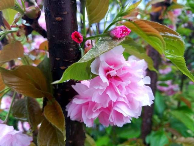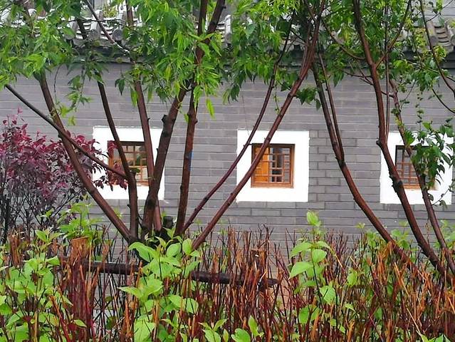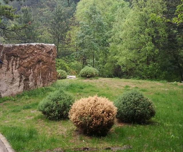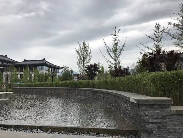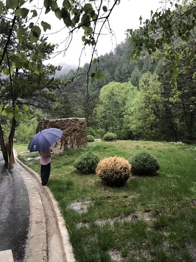 山里的天就像孩子的脸,早晨还是晴天丽日,下午已经细雨霏霏了,撑起伞,在度假区里信步,凝眸于枫叶上的水珠,穿过石盘铺成的小路,看红鱼在碧水里嬉戏,巨大的水车缓缓的转动,一座座汉唐风韵的建筑招引着我,雪霁堂、百渡食府、竹里馆、白桦林·温泉谷,诗意的分布在度假区里,远山将度假区环绕在中间,像母亲温柔的怀抱,我一向是个守规矩的人,今天却第一次逃了课,忘记了竹里馆里的诗韵墨香,一任自己沉迷在这清宁的世界里,伞间有樱花的芬芳。