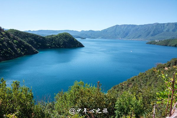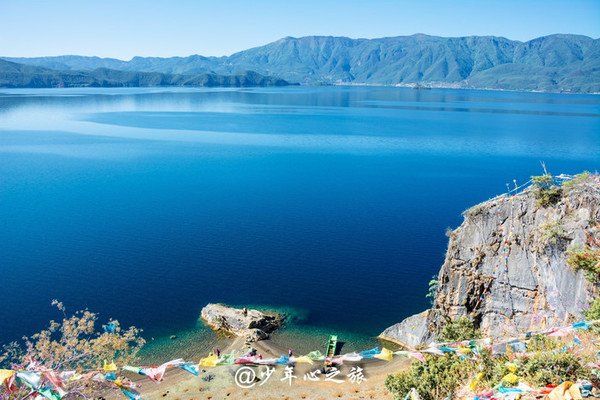 神奇的泸沽湖,看到没,中间有条浅蓝色水带,给这平静的湖面增添了不少韵味。