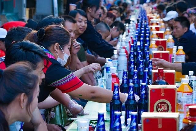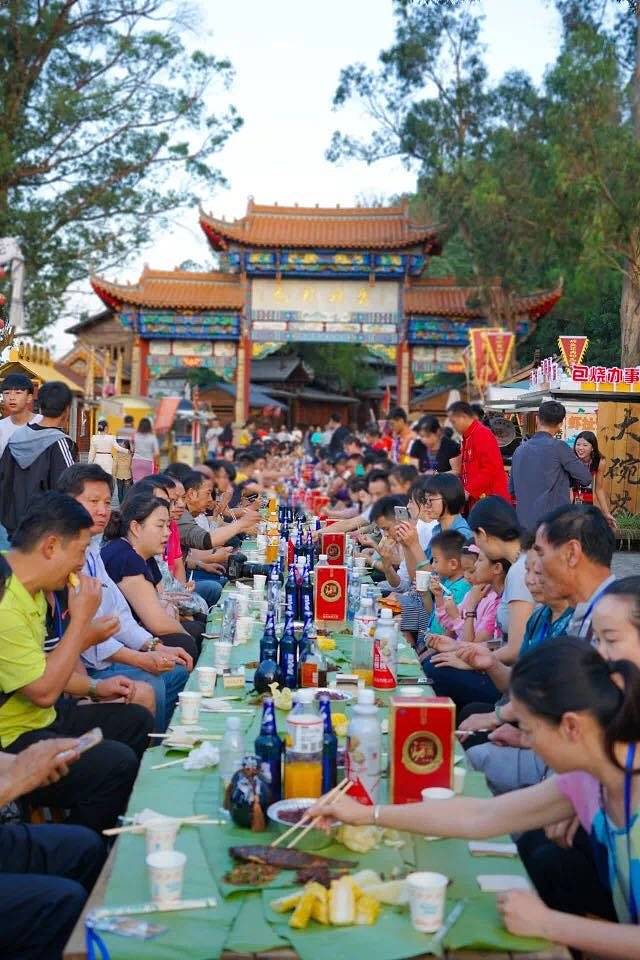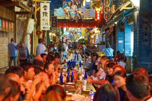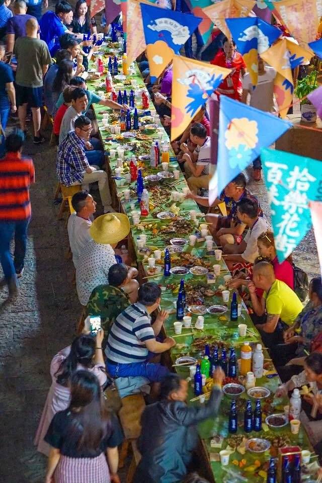 200桌长宴贯穿花街,气势非凡;1800名食客围桌而坐,笑语不断。