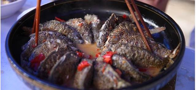 腌鱼是黔东南侗族特色美食。用稻田里捞上来的新鲜田鱼,处理过后,放入辣椒面、盐、适量白酒、白糖等调料,再与蒸熟且放凉后的糯米饭混合在一起,放入瓷坛中密封腌制,两个月左右,腌鱼变酸入味,则可取出用菜油煎食,味道酸辣可口,肉质细嫩,极其美味。