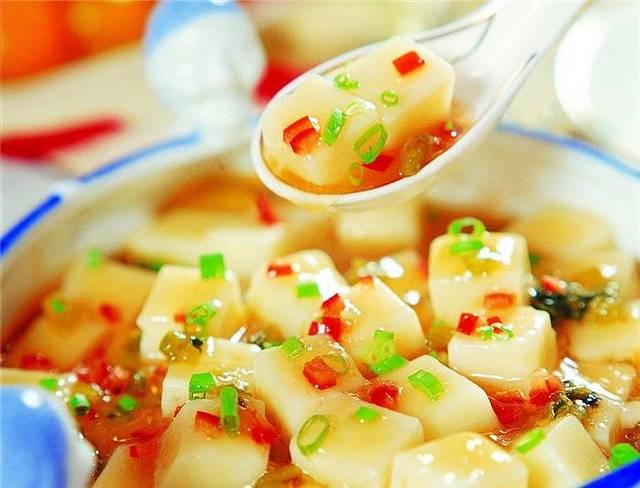 黔东南的米豆腐跟其它地方稍有不同,很多地方做的是红油米豆腐,而黔东南米豆腐会加入当地毛辣果做的酸汤,让其吃起来更鲜美。右图的米豆腐因为形状似虾在,黔东南被称为“虾子米豆腐”。