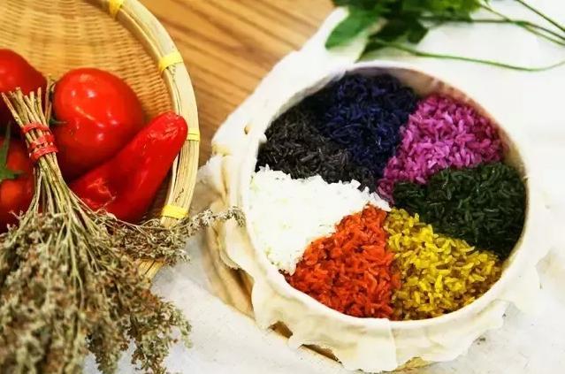 五色糯米饭五彩缤纷,鲜艳诱人,气味清香,天然色素对人体有益无害。