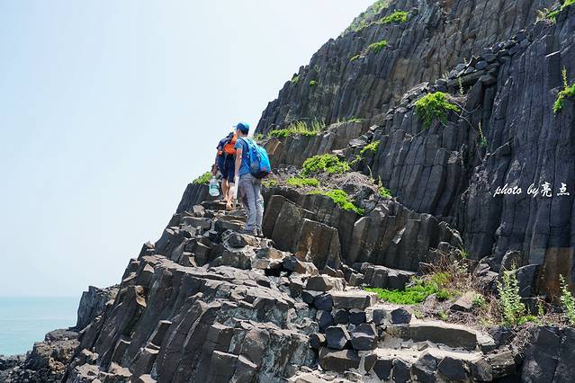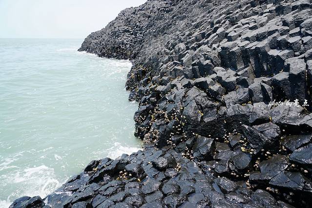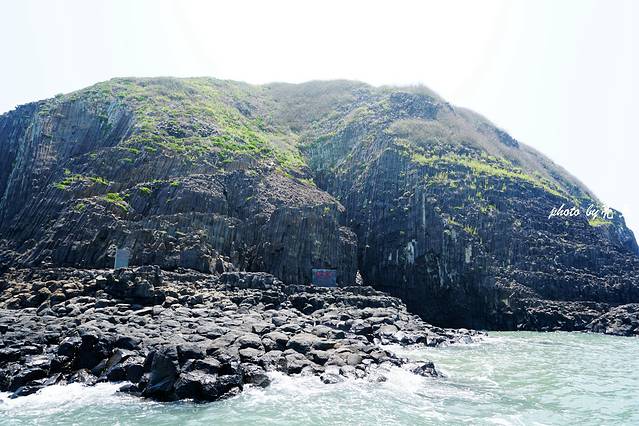 在船上远远地看南碇岛并没有什么特别之处,外表就像一个普通的小山包,孤零零地坐落在大海上。近岸渐渐能见到线条清晰的黑灰色岩柱整齐排列垂挂入海,密集排列的石柱像凝固的石瀑布。