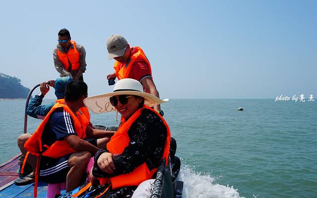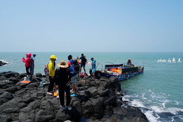 按照约定的时间船家来接我们,海浪很大,岛上没有码头、没有沙滩,我们乘坐的大船无法靠岸,由一平底小船接我们离岛。