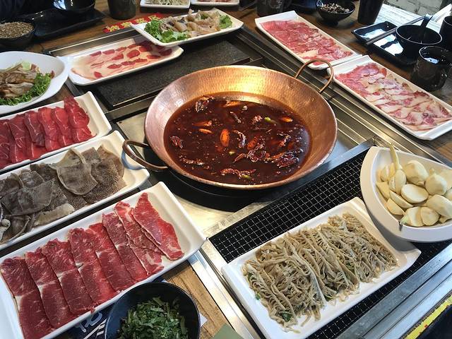 集全国首创专利火锅、炭烤、石板烧一桌三吃,营造出一种全新的体验感。