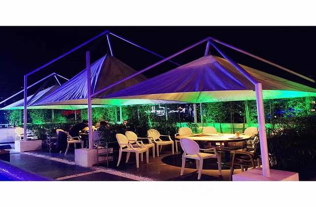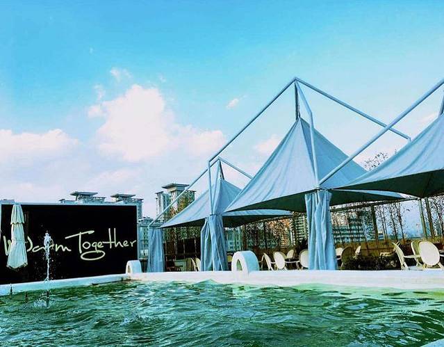 在水池边吃火锅,水池碧蓝,周遭生长着热带类植物,给人感觉穿越到了清新的东南亚,让人心情疏朗。