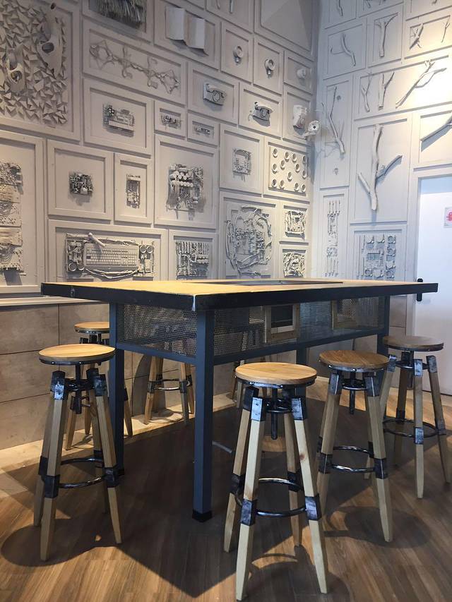 还有装修清新的犹如艺术馆的用餐区,在其间享用美食,会觉得自己在被艺术与美食陶冶融化。蓝+白构成了暖炉的主色调——时尚简洁,白墙红砖。