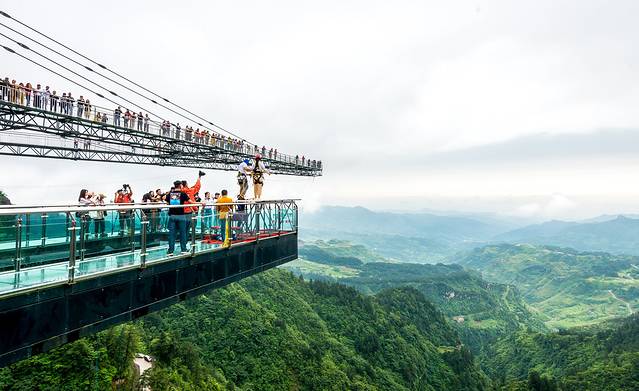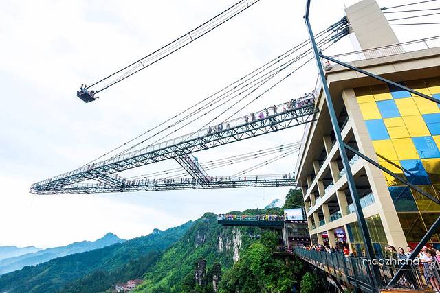 廊桥成“A”字形,位于近300米高的悬崖峭壁之上,向外悬挑出近80米。桥面全是透明的大玻璃,对于恐高的人来说,让身体悬在半空简直望而生畏,那摇摇欲坠的感觉颠覆你对高空刺激的认知。