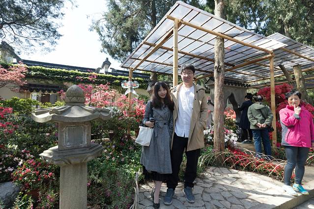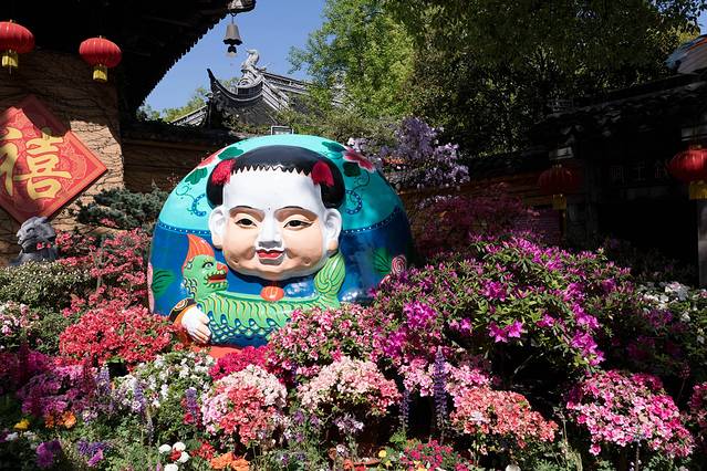 买了联票,恰逢杜鹃花节,一入门便是长长的杜鹃花街。此时杜鹃开的正热烈,两排竹制花架,其内用风筝、鸟笼等做装饰。随着热闹的人潮走着,产生了过年庙会的错觉。