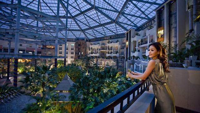 整个酒店呈环形建筑,中间是热带雨林的偌大空间。我定的是亲子主题房,房间面积很大,古色古香的格调,又带有欧式风情,木质的家具感觉很舒适,房间还摆了一束鲜花一份水果,很贴心哦。