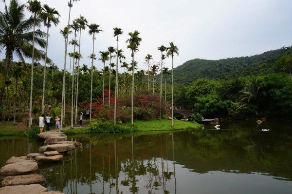 湖边大片的槟郎树林,夹杂着大片的粉紫色的三角梅,像画一样的失真,却又那么的近在咫尺。宽阔的湖面将一切倒映咋水中,形成绝美的镜面热带水墨画,湖中有天鹅缓缓的游动着,让景色从静止变为动态的,美到窒息