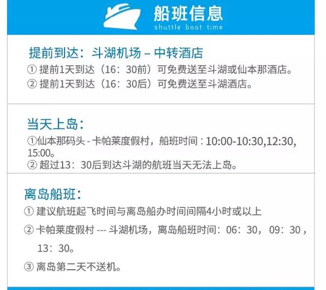 3、订机票的时候一定要注意衔接好飞机起飞降落时间和度假村的接送时间,一定要离岛的当天去机场,隔天不送(如图所示)