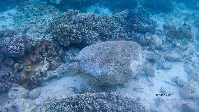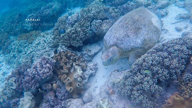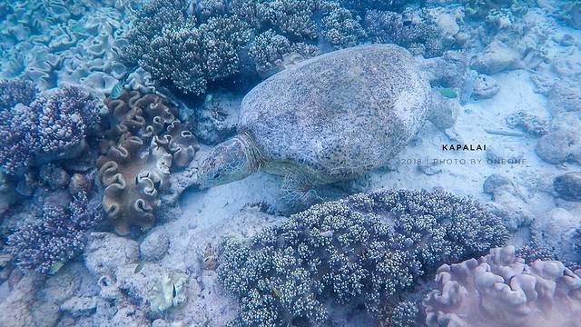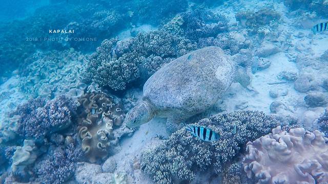 封先生一直都在抱怨说卡帕莱不如麻袋,其实我觉得风景还是可以媲美的,唯一最大的不同在于麻袋的水屋是可以直接下海的,就在自己房间外就可以浮潜,随时随地不受限制,而卡帕莱诸多限制,浮潜只能是规定的时间规定的区域。这里的鱼还是很多的,但是因为划定的浮潜范围太小,离岸太近,导致了人比较集中,水被搅得有点浑,好在在第四天遇到了一只超级大海龟弥补了我没有看到魔鬼鱼的遗憾。