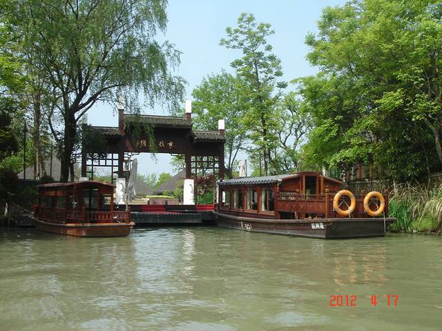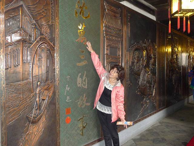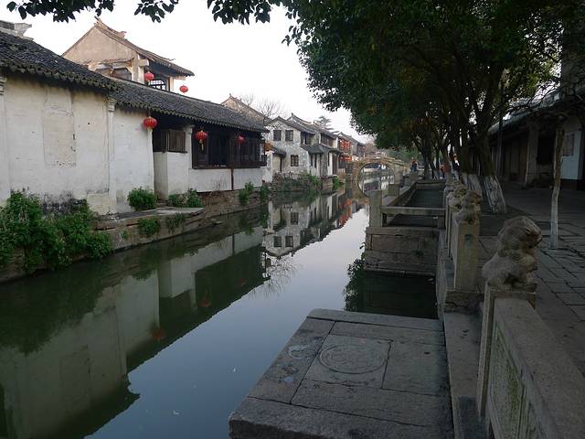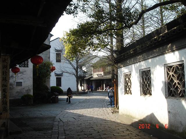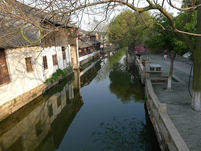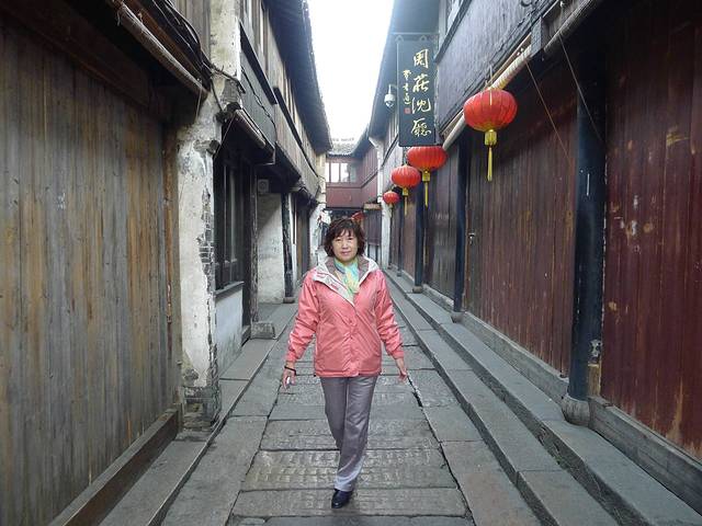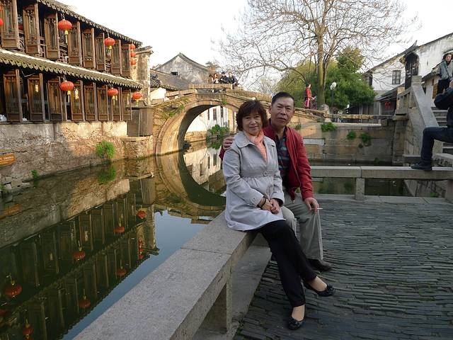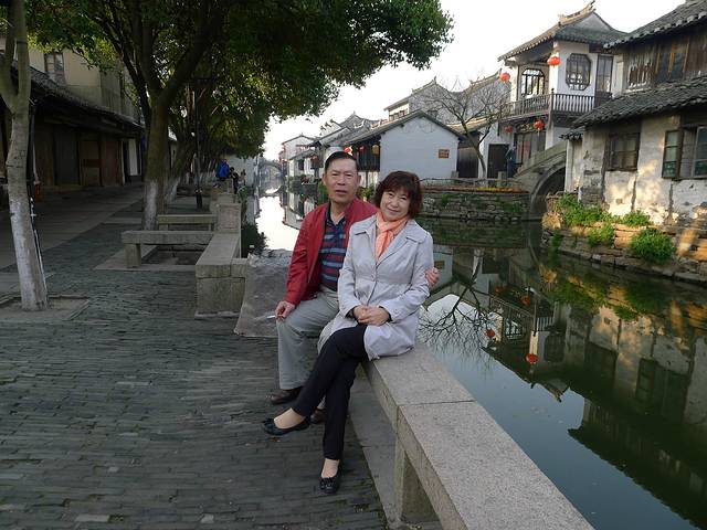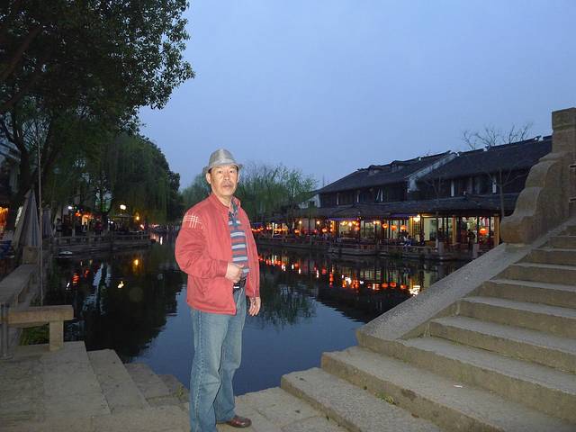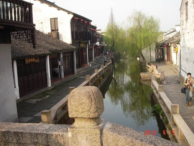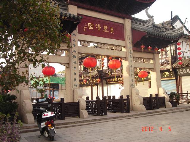 4/4:今天准备中午乘汽车去周庄,还有半天的时间。心想各个城市的中山公园都 不错,正好利用这个时间去一趟。8:50到中山公园,这里远不如我的想象,只有一处汉白玉的雕塑很精美漂亮,没多一会便出来了。路经苏州河,想起92年到上海那时苏州河的混和臭给我留下了极深的印象,那次我们就住在了河的附近,臭味熏得大家几乎一夜未眠。如今的水虽然不能用清澈来形容,也已经是今非昔比了。13:20从上海南站客运站车费20元约一个半点到周庄。是到莘塔客运站,再坐1元的公交到古城售票处附近,门票100元三天有效。提前预定好了在沈厅后面的住处,我俩便拉着行里向城里走,发现街边多的是住处,由于古城大都 是石板路,拉杆箱行走颠簸很厉害,要不是已经交了宿费真的不想多走了。安顿好了出门快16点了。周庄古镇四面环水,因河成镇,依水成街,以街为市。井字型河道上完好保存着14座建于元、明、清各代的古石桥。800多户原住民枕河而居,60%以上的民居依旧保存着明清时期的建筑风貌。主要景点有双桥、沈厅、张厅、富安桥、全福寺、迷楼、图书馆、周庄舫、澄虚道院等。我俩先到了沈厅,里面有一幅好大的精美铜质壁画,上面用图片和文字记述了沈万三的生平。些然后就信步在古城之内,走到了南湖、全福寺、富安桥、双桥直转到饥肠辘辘。见到街边随处都在卖的万三肘子,自然不能错过,又买了食物和一小瓶白酒,回到住处晚餐。两个人一个肘子竟然吃得舔嘴抹舌的。想到应该看古城的夜景,便再次出门。夜幕下的古城安静、祥和,河两侧的街灯和商铺的彩灯倒映在水中错落有致、交相辉映。我俩走着、看着、聊着很晚才返回。