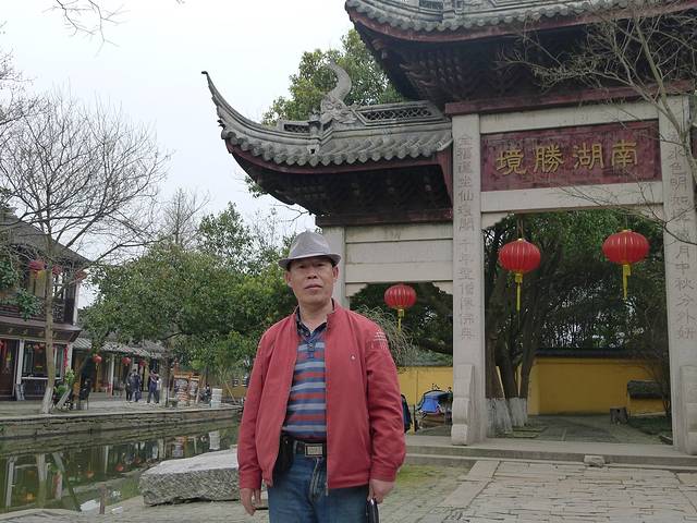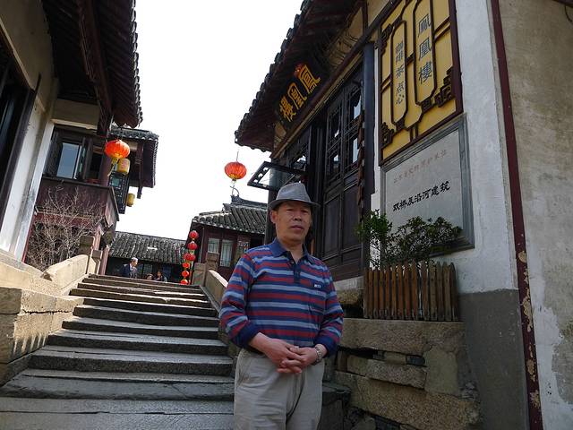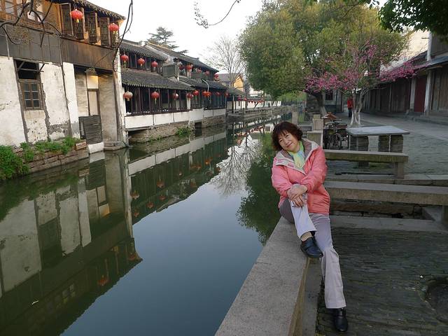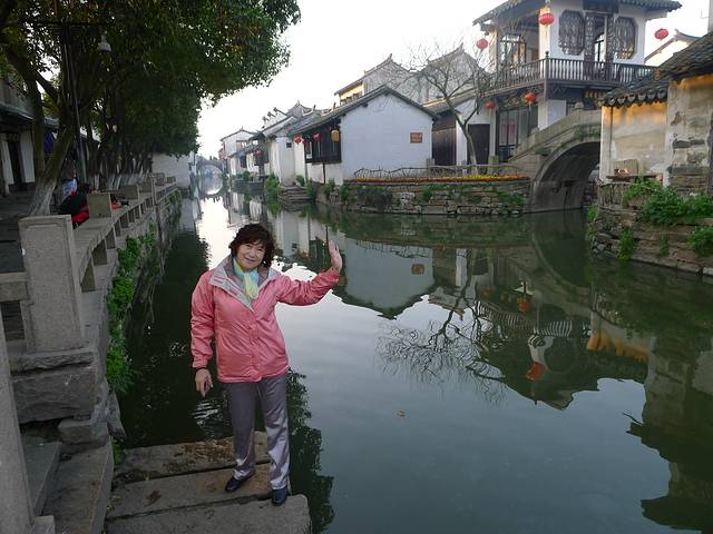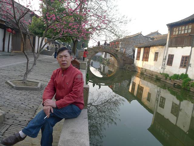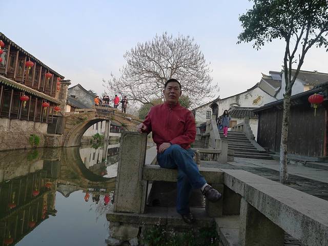 5/4:为了看古城的清晨美景我俩早早起床。白天拥挤、噪杂街面此时洁净、安宁。踩踏着石板铺就的街道、沐浴着温暖和煦的阳光、呼吸着湿润清爽空气,真的好温馨好惬意。晨曦中的石桥、房舍、倒影在如镜的水面,如诗如画。周庄的清晨真的好美!好美!!这是在网上看到提示:一定要住在古城 一定要欣赏周庄的傍晚和清晨,所特意安排的。太阳升得高了,我俩便信步走到了古城的外围,又从昨天入园的正门进入。两个多小时绕来绕去又走到了双桥,回去重新洗漱。8:40又向古城的另一侧走去,南湖的东侧都是漂亮的新建区,这里遍布着各种名目的美 术馆、艺术馆、美术 院、艺术院。再向东走就是沈万三的故居,参观完故居,我俩穿过南湖大桥来到了墨缘斋、南湖园全福讲寺。这里的亭、台、楼、阁、榭在清澈湖水的衬托下,更加好看;假山、石桥、长廊、绿柳贯连期间,使得景色更加漂亮。近13点才找了家有特色的餐馆。走到游船售票处,刚好有两位美女在凑人,我们四人70元一条船。摇橹的中年男子谈兴很高,不停地说着介绍着,全程约20分钟 左右。然后去了张厅。就这样慢慢悠悠、走走停停,站着瞅热闹看风景、坐下稍休息、吃特产,直逛到了夜幕降临彩灯华放,才有了回归的念头。昨天的肘子没尽兴,再来一个大点的,买小酒找小吃打包,唉!这个肘子太大了,只得待明天再解决了。