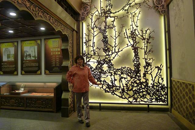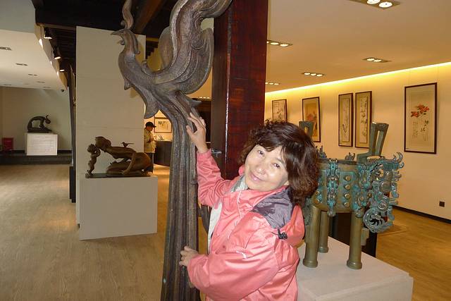 14/4:早9:15到达西湖,到了那沿湖向南走,经晚节留香、问水亭、莺歌燕舞、过涌金桥、金牛出水、钱王神祠、柳浪闻茑不觉间来到了吴山广场和吴山文化公园,从山上走下来18:20误撞进了江南朱家铜屋。朱炳仁铜雕馆是中国唯一的铜雕大宅,以铜为精华将中国传统造型艺术中的绘画、雕塑、建筑、书法、交融汇合,在这里可以欣赏到铜书画、铜壁画和铜制佛像等,感受独特的铜文化和佛教文化。 博物馆规模宏大,总建筑面积近3000平方米,除立面墙和地面外,门、窗、屋面、立柱、家具等全部采用铜质结构和装饰,共耗费原料铜125吨。博物馆整体风格以明清时期典型的江南民居风格加以呈现,回廊穿连,厅楼叠筑,铜光闪烁,古朴华贵,被誉为“江南铜屋”。这里的铜画铜雕、铜景铜物、铜树铜花……这就是一个铜的世界,一切都令我大开眼界目不暇接 、欣喜若狂,而且可以随意拍照。在里面足足转了一个小时才出来,附近就是小吃街。
