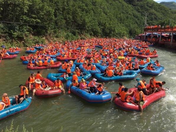 进了大门还要走一段没有什么风景的路,也没有遮阴的树,那一会儿正是阳光明媚,一会儿就把皮肤晒疼了。走了十五六分钟之后来到了天门峡漂流起点,好多人在等待放水,好不热闹。