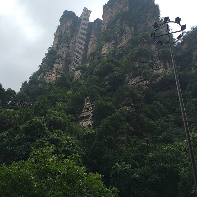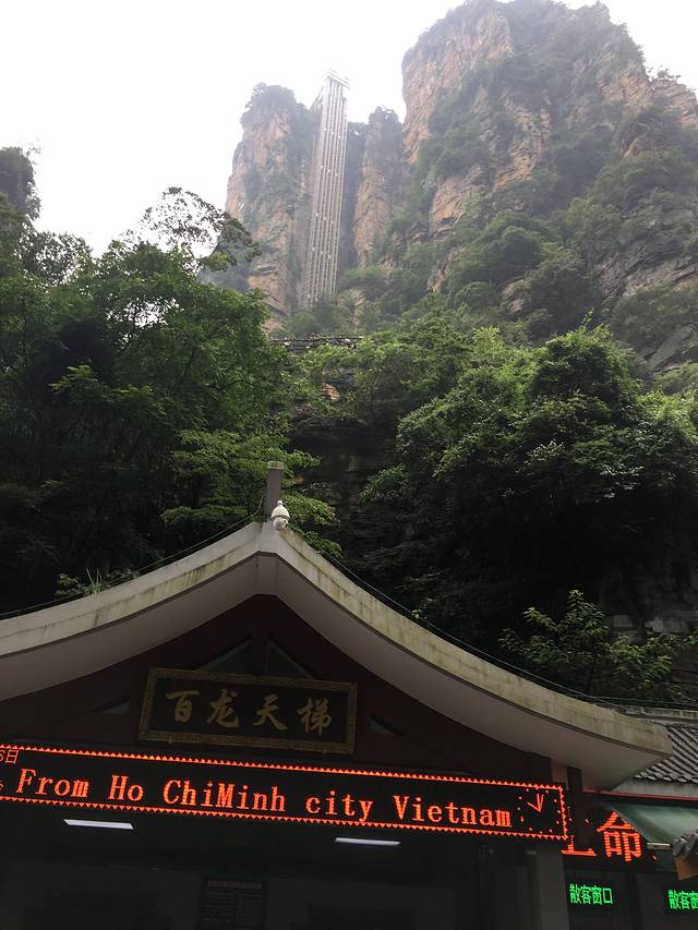 去往坐百龙天梯的站口,会有指示标牌,有一段很长的蜿蜒的木质楼梯要爬,要去的做好心理准备,我是爬的够呛,直接累趴,。坐百龙天梯的人挺多的,可能也是因为名气大,进去排队密密麻麻全是人头,排了将近两个小时才轮到我们,百龙天梯的速度是5米/秒,运行一次1分多钟,一次搭载50人。乘坐时周围景色是完全看不到的,白茫茫一片,因为速度太快了,而且我是站在电梯门口,靠在电梯里面,是玻璃的,外面的全景,全部看到,而且也是能感受到快速的感觉吧,可惜了我,站在电梯门口,只能远远观望一下,体会不到那种极速的感觉。百龙天梯非常高,镶嵌在一座山中,仰望百龙天梯更是觉得明亮、壮观不已,它仿佛和山溶为一体,固然这个高科技建筑坐落在这里有点破坏此时大天然的那种天然风光,不外相对于它给人带来的匡助以及印象,这些都可以忽略不计了。 百龙天梯固然非常高,不够他的运行速度相称快,从山下到山上,不外到二分钟便可以到达山顶,相对于站在这座天梯观看远处的那些锦绣、壮观的张家界景点,这么点钱的确是可以不心疼了,但是要注意由于电梯比较大,所以如果靠后的话,基本上也看不到什么好的景色。在百龙电梯的上乘站附近有一个观景点,据说是看将军列队的最佳点,但是由于赶时间也就没有过多的停留。