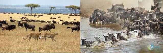 清晨,在导游的带领下,驱车深入大草原,去全身心地体验非洲的野性和自然。7月,观赏动物大迁徙的最佳地点在塞伦盖蒂!届时数百万头发出低吼、欢快奔腾的角马(牛羚)在塞伦盖蒂平原从南向北迁徙,寻找水草鲜美的草原,在十月左右再返回南边。角马大迁徙是全球最大规模的动物迁徙,惊险壮观的过河场景夹杂着九死一生的“险情”,堪称动物世界里难得一见的盛况,也称“天堂之渡”。