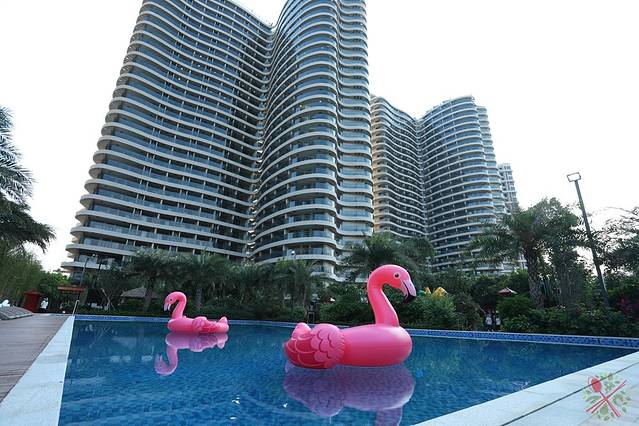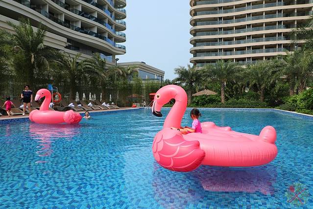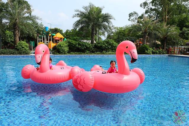水上滑梯最受欢迎,孩子玩了很多次都不腻,直到看到泳池上粉红色的火烈鸟,顿时引发孩子的尖叫,坐上去之后就不肯下来了,甚至还自己试图滑船。水上步行球适合成人玩,如果孩子要玩的话,记得陪着他一起才行。