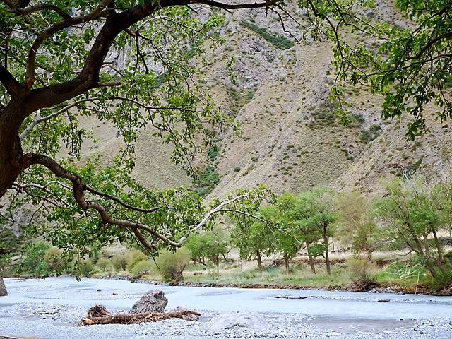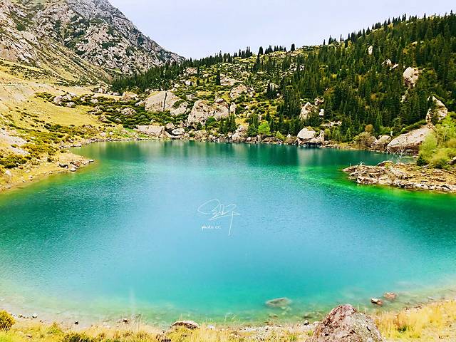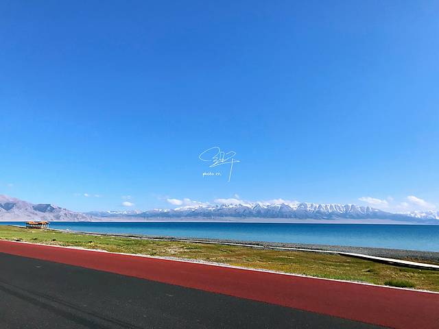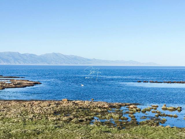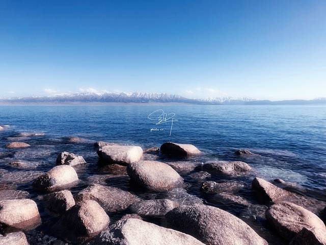 漫步在湖边上,迎面吹来的风胜似海风。湖水由近到远呈现出不同层次的颜色,细浪不停地拍打在岩石上,仿佛在给对面的天山招手打招呼。