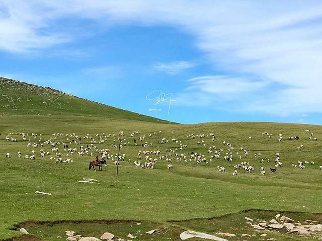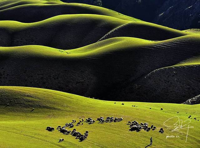 天山以北的草原以优美的线条而秀美,而天山以南的草原则辽阔而壮美。放眼望去,成千上万的牛羊在巴音布鲁克草原上悠闲地闹着,美丽的天鹅在湖面上静静观望,那让人惊艳的曲线正是九曲十八弯。可惜的是一大波乌云压日,没能亲眼见证9个太阳挂天上的奇观。