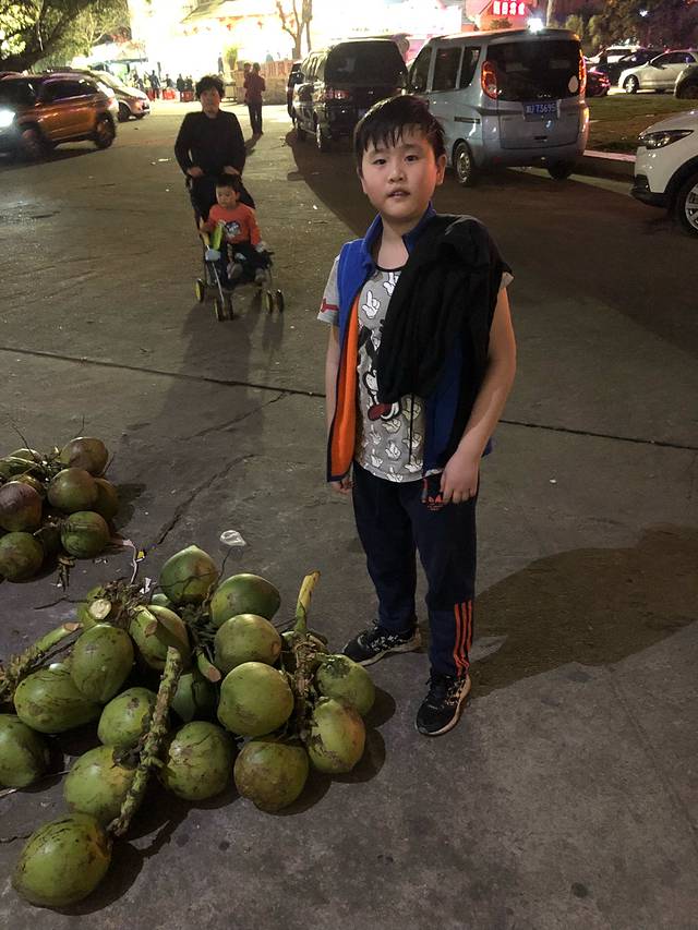 欣赏了灯光绚烂的别野群,大家都意犹未尽,完全没有任何睡意,继续在街道里漫步。走了一会儿,就看见了一家卖耶子的商贩,弟弟看了,马上就向那凑去。大家也跟了过去,橄榄绿的耶子真让人嘴馋!正好还没吃晚饭,喝点耶子汁填填肚子。