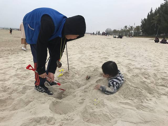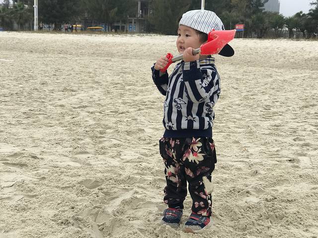 不久,我们就来到了银滩,走着走着,不一会儿就看到了卖沙滩工具的商店,我和弟弟看了,就飞快地跑了过去。卖了一套沙滩工具,到了沙滩,我们就完了起来。
