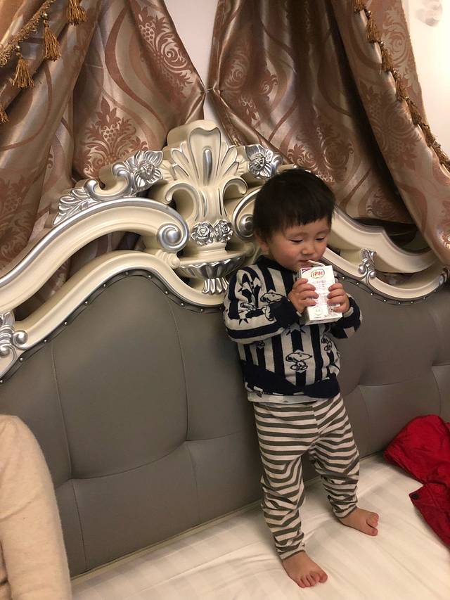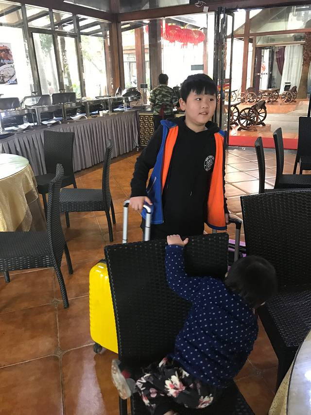 收拾好行李,准备出发。正好,宾馆里还有自助的早餐,弟弟不一会儿就爬上了餐椅上。等待着早餐。
