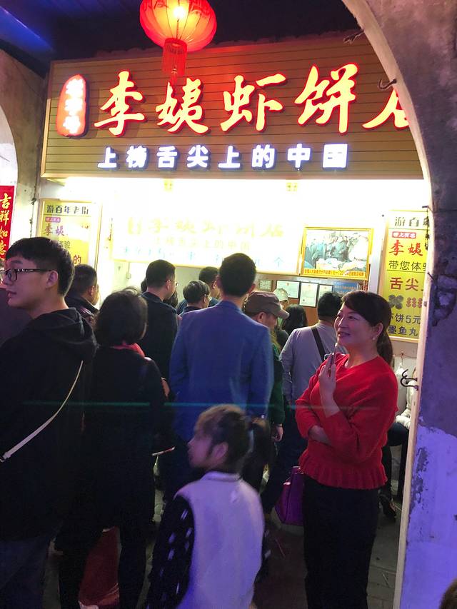 李阿姨虾饼店,店铺前人声鼎沸,很多人在这里排队买,我们也加入了这个行列中。