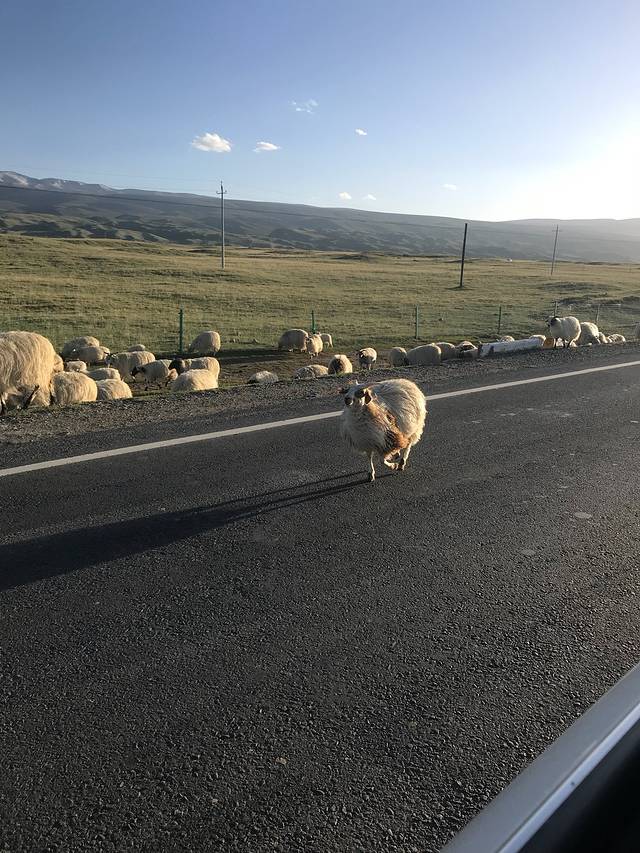 中午在倒淌河附近的饭店吃过饭后,我们就启程去青海湖了。大概一个小时的车程。不要以为青海湖才是目的,我觉着在车上这段路才是真正的美。一路上总会碰到牦牛和羊,眼前就是美丽的青海湖。整个人都被洗涤了。