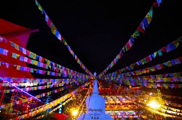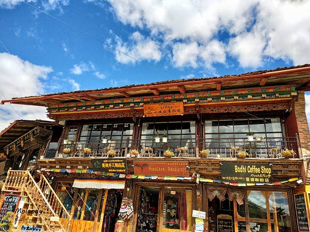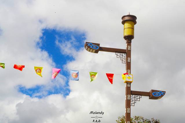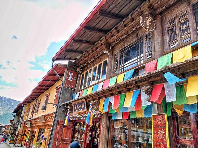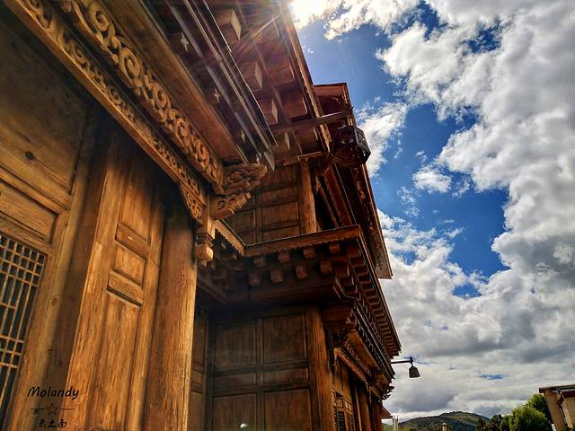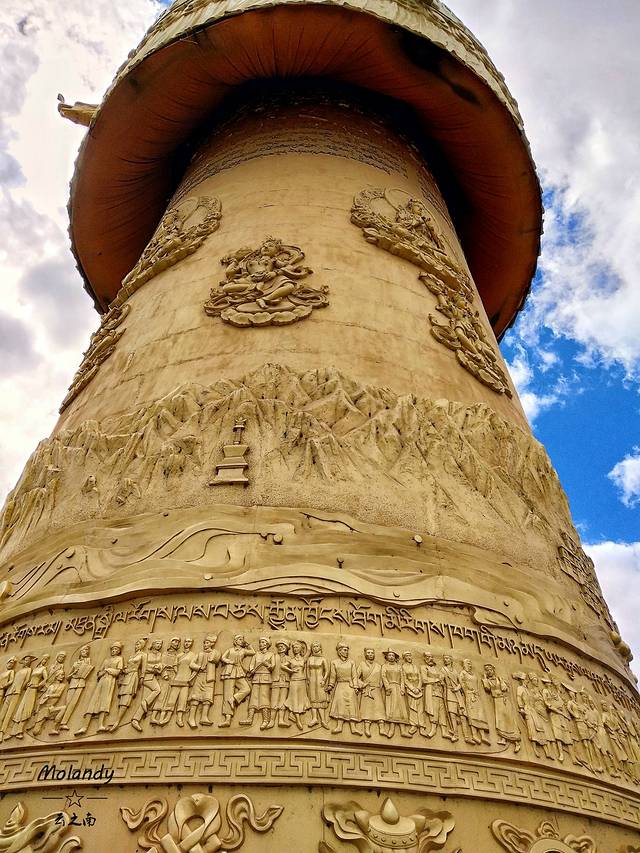 独克宗古城,充满藏族文化气息的古城,古城里面的龟山公园上的转经筒是这里的亮点,这是世界最大的转经筒,整个转经筒大约有5层楼那么高,筒身为纯铜镀金,在筒壁上端用浮雕篆刻着文殊,普贤,观音,地藏四大菩萨,下端刻着佛家的八宝图,筒内还藏有经咒、无字真言等共124万条和多种佛宝达16吨。转经筒下面有一圈扶手,是供人推动转经筒用的。要想转动如此巨大之经筒需众人同时着力,转满三周,就可以消灾祈福,吉祥如意。转经筒非常重,的确需要十几个人一起参与推动,刚好我们去的时候一起转经的人比较多,不然就转不动。