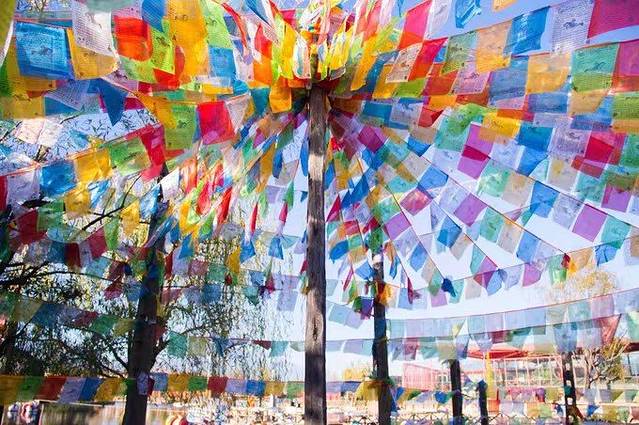 在藏区,随处可见挂在山顶山口、江畔河边、道旁以及寺庙等各处被认为有灵气的五彩经幡,是藏区高原上一道独特的风景。经幡上面都印有佛经,在信奉藏传佛教的人们看来,随风而舞的经幡飘动一下,就是诵经一次,在不停地向神传达人的愿望,祈求神的庇佑。这样,经幡便成为连接神与人的纽带。风幡所在即意味着神灵所在,也意味着人们对神灵的祈求所在,风幡寄托着人们美好的愿望。除此之外,还有白塔和转经筒,藏传佛教认为,持颂真言越多,越表对佛的虔诚,可得脱轮回之苦,因此人们除口诵外,还制作“嘛呢”经筒,把“六字大明咒”经卷装于经筒内,用手摇转,藏族人民把经文放在转经筒里,每转动一次就相当于念颂经文一次;白塔是藏族的佛塔,是作为一种象征宝物,供信徒顶礼膜拜,同时又可以盛放圣贤的舍利,还可以放置活佛骨灰或遗体以及经书圣物等,又是别具风格的藏传佛教建筑雕刻艺术,还有一种是藏族葬俗中最为尊荣的就是塔葬。(以上百度来的)