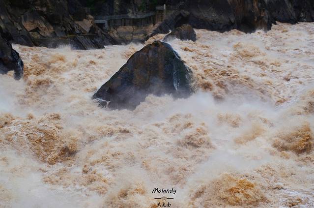 虎跳峡在由丽江去香格里拉的路上,江水突遇玉龙、哈巴两座雪山的阻挡,原本平静祥和的江水顿时变得怒不可遏,虎跳峡是万里长江第一大峡谷,横穿与哈巴和玉龙雪山之间因猛虎跃江心石过江的传说而得名,观景台近到与惊涛骇浪咫尺之隔,木制栈道都被巨浪打湿。