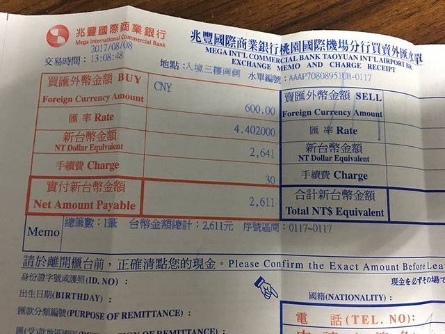 到达 桃园 机场后,下飞机,在出境敲章不到一点的地方就能看到一个牌,可以在这里兑换台币,我看了下,人民币兑换台币的汇率是4.3。这个时候车行给我负责送车的人已经给我发了微信,在外面等我了,叫我从机场出去后告诉他,我在哪个门,他再上来接我。