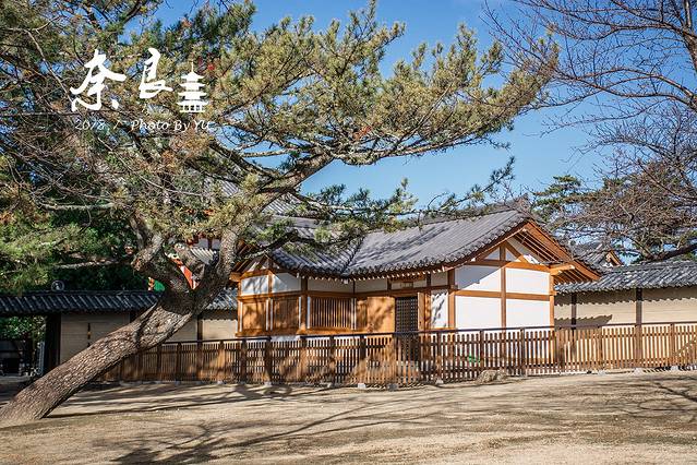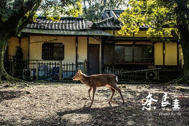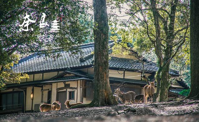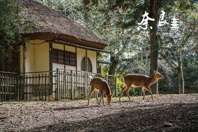 古老的和式房屋,阳光透过青翠的树,鹿群悠闲地在草地上游走。