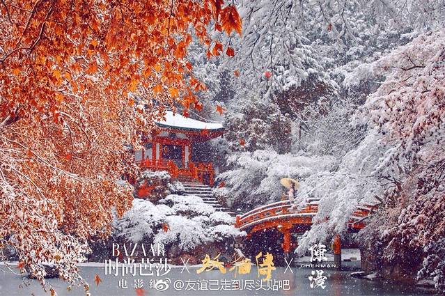 时尚芭莎十二月刊里有一组陈漫给妖猫传拍的一组片子。其中有一张是张天爱站在醍醐寺弁天堂前的虹桥上。虽说这张照片是合成的……但就因为这张照片我当即决定说什么也要一睹醍醐寺真容!