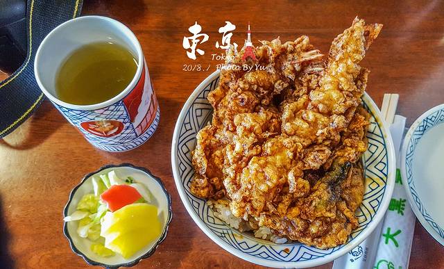 招牌天丼,里面有两只大虾和综合蔬菜天妇罗,分量特别足,虾的个头比碗都大,渍物用来解腻。他家的天妇罗是炸完之后浸泡在酱汁里,这样比较入味,虾肉口感不错,弹牙,米饭粒粒分明,酱汁很下饭。