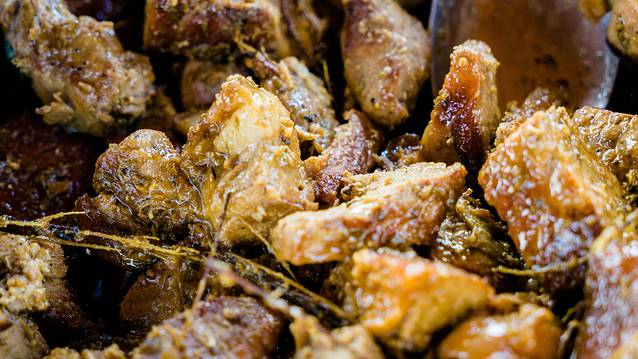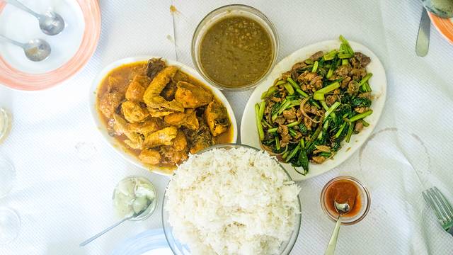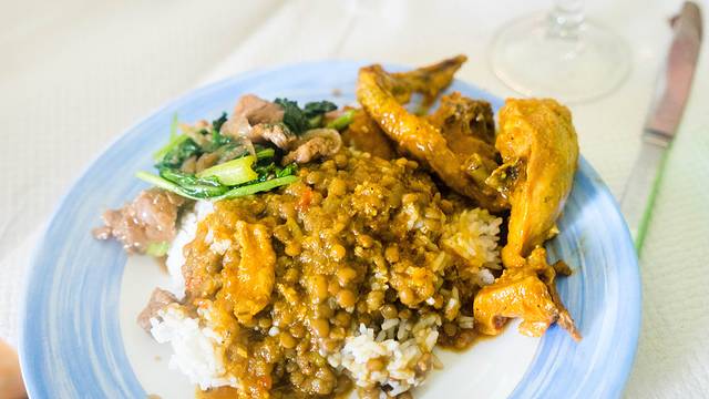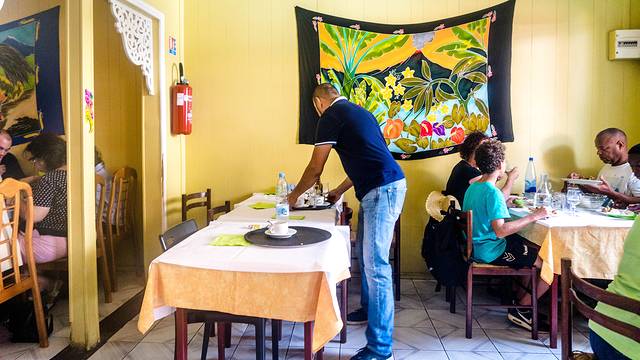 这儿的前菜是当地的一些油炸小吃,血肠,素丸子,春卷之类的,味道还是很特别的。主菜是一份鸡肉和青菜炒肉,克里奥尔饭的吃饭其实跟印度人的吃法有些类似,我们需要将菜全都拌到饭里,再倒上这儿的调料,跟我们吃克里奥尔野餐时的吃饭一致,当地人甚至会直接用手抓着吃,味道非常不错。甜品是一个甜掉牙的烤香蕉,爱吃甜的可以品尝一下。