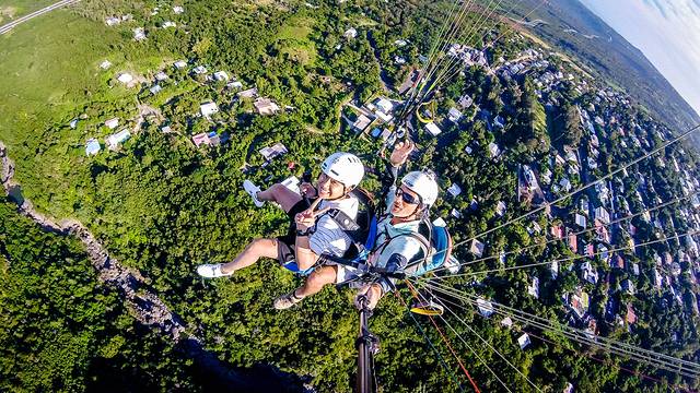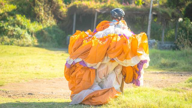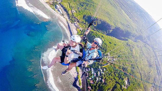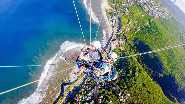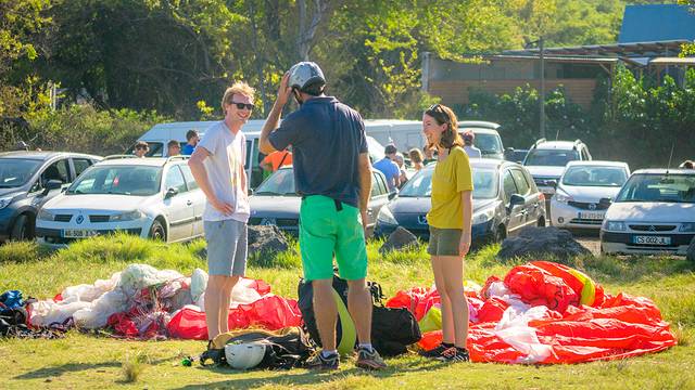 我的教练是一名看上去50多岁的白人大叔,听说留尼汪的人都比较长寿,所以50岁于他们而言仅仅是正当年。一开始他简单讲了一下注意事项,注意事项简单的不得了,就是一开始尽全力的跑,不要停,降落的时候伸直腿继续向前跑两步,仅此而已。