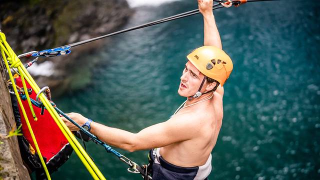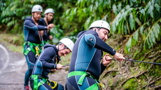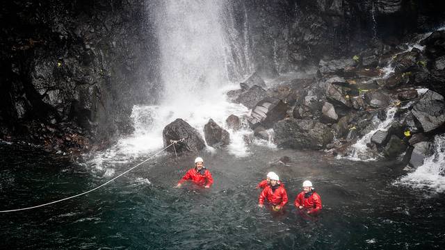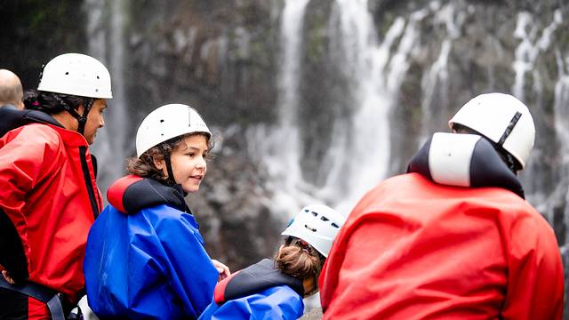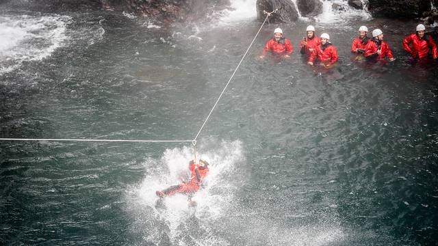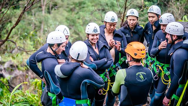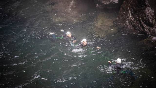 溯溪时会有一个向导全程跟随,脱掉衣服穿上泳衣,再套上溯溪鞋和湿衣,前期准备工作就做好了。不过我的准备工作多花了些时间,因为我忘记带泳衣了,你能想到我出发时性质冲冲,打开行李箱后只看到了泳帽,又不甘心的翻遍了整个行李箱后的失落吗。不得已,只能靠内裤了,不过事实上也不会有人介意你穿了什么,毕竟在老外心中似乎只有全裸和穿衣服两种。