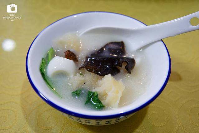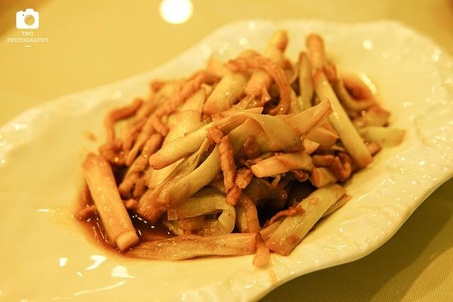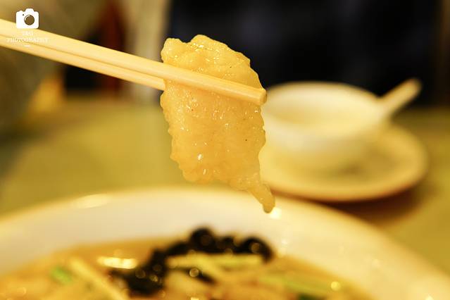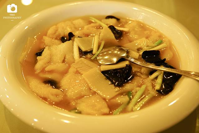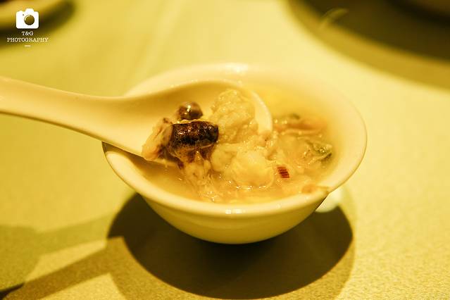想要把里脊做成这般模样是很费事的。据说是精准刀工+流水冲洗几小时+多重调味的结果,另外里脊丝里的汤汁自然不是原汤,而是前文提过的高汤里的另一种——清汤。所以无论是里脊丝还是汤汁,其实都是讲究的结果,味道嘛,自然是大赞,有种荤食素吃的感觉。
