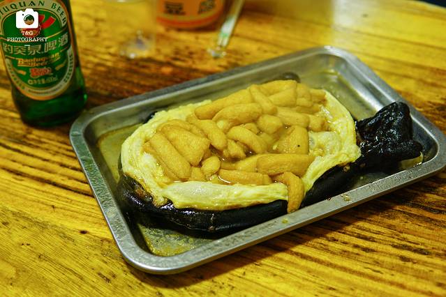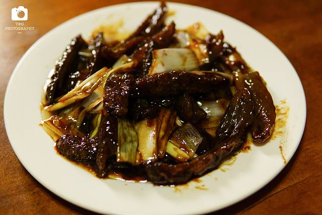 山东大葱天下闻名,香辛爽口,油被葱段爆香再加上海参炒制糖色勾芡,颜色深重,咸甜香浓,口味却是滑滑嫩嫩