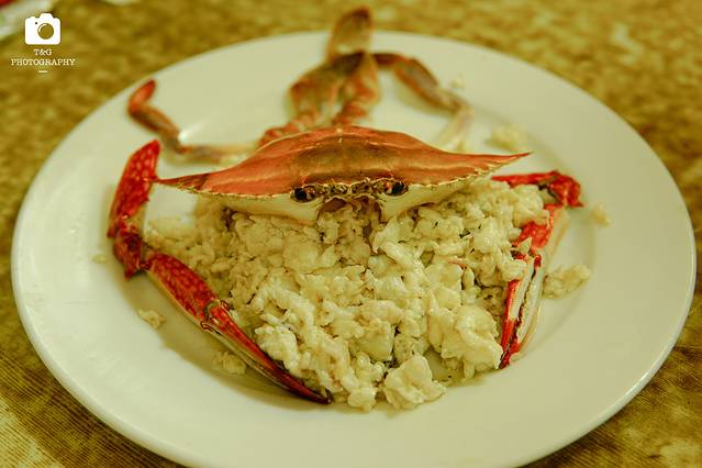 看到一只螃蟹壳“护住”这白花花的一大盘可别惊讶,并不都是它的肉哦,其实是鸡蛋白炒蟹肉,蟹肉碎在清香的蛋白里,要仔细吃才可以吃出来,不过鸡蛋白经与蟹肉一炒,鲜度立马多了三个加号。