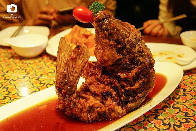 都知道吃鲤鱼属于北方特色,而糖醋黄河鲤鱼是其中代表中的代表。它的造型首先就很抓人眼球,披挂着“黄金甲”的鲤鱼以一个跃龙门的姿态昂首挺立,顶着个...圣女果。