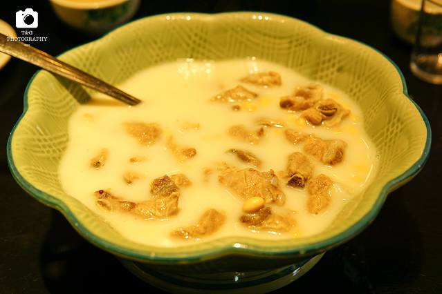 奶汤排骨,亮点是奶汤。这里的奶汤,可不是牛奶或者奶油沏汤,而是普通鸡鸭猪骨的高汤中,又加入了猪肘猪爪这种胶原蛋白含量高,煮的浓稠醇厚的那一挂。