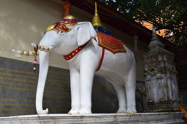 寺内的白象,白象是泰国的圣物。传说舍利塔塔址是运载佛骨的白象选定的,大象行到此处停步不前,恭运佛骨的人认为这是佛祖的旨意,建造了这座舍利塔。