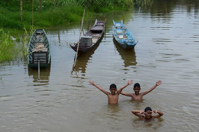 在河里游泳的孩子。